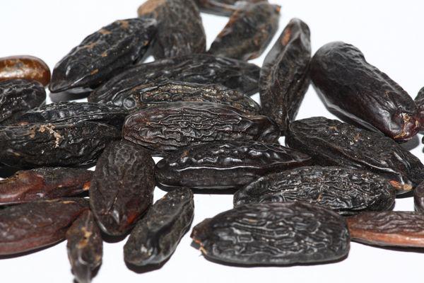 Tonkabohne - sieht aus wie eine dunkle Mandel und ist der Samen des Tonkabaumes, der in der südlichen Karibik bishin ins nördliche Südamerika wächst. Die Bohnen haben ein intensives, vanilleartiges Aroma welches durch den Inhaltsstoff Cumarin hervorgerufen wird. Die Verwendung als Gewürz war in Deutschlan zeitweise verboten, da man dem Cumarin nachsagt, krebserregent zu sein. In der modernen Küche tauchen in letzter Zeit allerdings wieder einige Rezepte auf, welche die Tonkabohne verwenden. Als Gewürz werden Tonkas sehr sparsam eingesetzt. Die Bohnen sind hart und werden am besten mit einer Reibe, wie Muskat, gerieben. Genausogut können sie auch ausgekocht werden oder in Rum eingelegt werden.