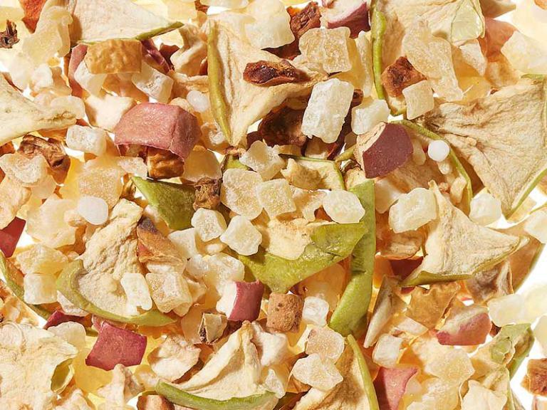 Zutaten: Ananaswürfel (Ananas, Zucker), Apfelspalten, Ingwerwürfel (Zucker, Ingwer, Säuerungsmittel: Citronensäure), Apfelwürfel, Krokantstücke (Zucker, Haselnusskerne, Invertzucker), Apfelstücke, Aromen, Perlensalz..