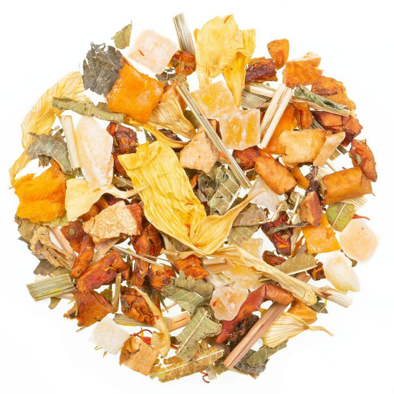 Zutaten: Apfelstücke (Apfel, Säuerungsmittel: Zitronensäure), kandierte Papayastücke (Papaya, Zucker), Lemongras, Aroma, Verbenenkraut, Kakistücke(6%), Saflorblüten, Sonnenblumenblüten, Vanillestücke(0,5%)
