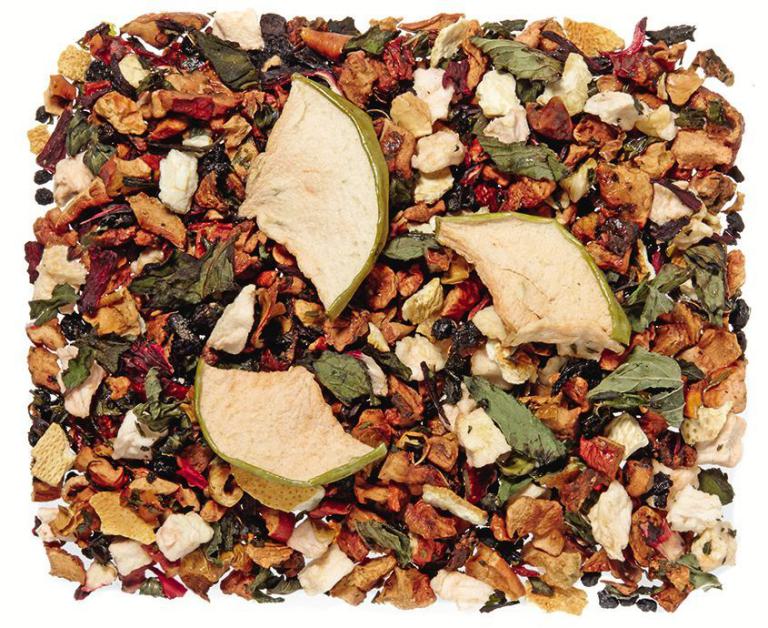 Zutaten: Apfelstücke, Zitronenschalen, Apfelwürfel, Hibiskusblüten, Fliederbeeren, Apfelspalten, Pfefferminze, Hagebuttenschalen, natürliches Limettenöl. Limetten-Note