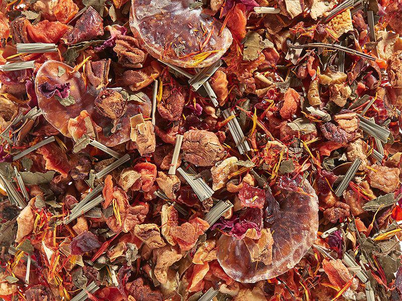Zutaten: Apfelstücke, gesäuerte Apfelstücke (Apfel, Säuerungsmittel: Citronensäure), Karottenflocken, natürliches Aroma, Hagebuttenschalen, Orangenschalen, Mandarinenspalten, Brombeerblätter süß, Lemongras, Färberdisteln, dunkelrote Rosenblüten