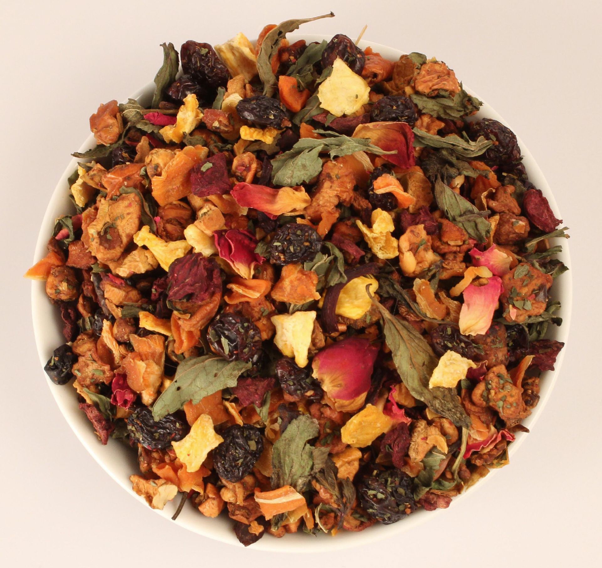 Zutaten: Apfelstücke (Apfel, Säuerungsmittel: Zitronensäure), Weinbeeren, Karottenstücke, Pfefferminzblätter Krüll (10%), Rote Beetestücke, Aroma, Melonenstücke(2,5%), Rosenblütenblätter.