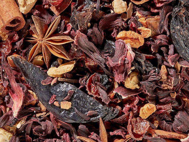 Zutaten: Hibiskusblüten, Hagebuttenschalen, Apfelstücke, Fliederbeeren, Pflaumenviertel, Zimtstangen, Sternanis, Zimtstücke, Aroma.