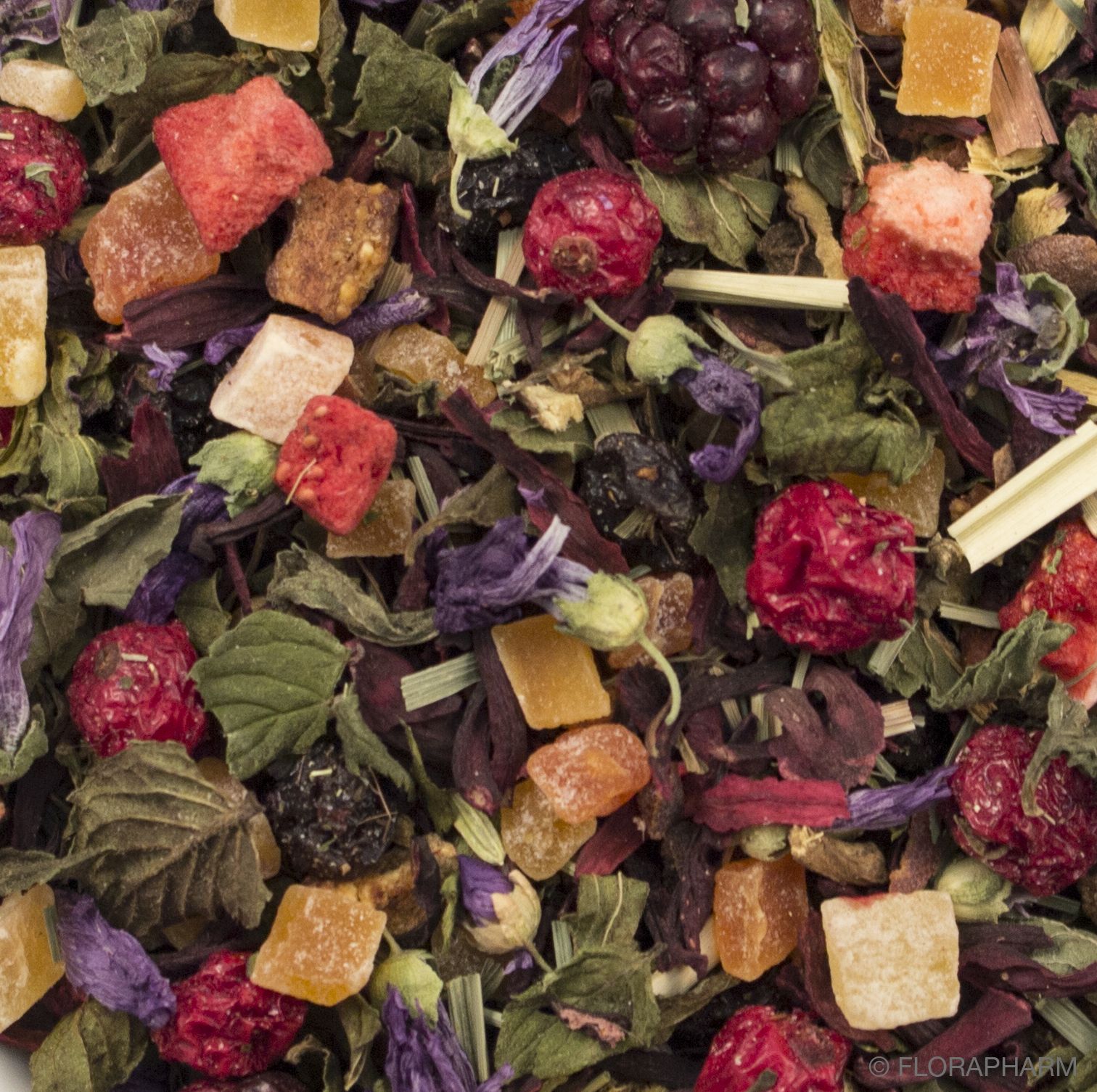 Zutaten: Kandierte Papayastücke (Papaya, Zucker), Hibiskusblüten, Birnenstücke, Weinbeeren, Pfefferminzblätter, Lemongras, Fenchel, Erdbeerstücke, Brombeeren, rote Johannisbeeren, Malvenblüten.