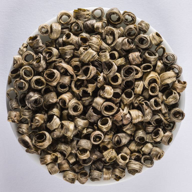 Ein wahres Feuerwerk der Handwerkskunst in reiner Handarbeit. Die Knospen werden nach Tradition für gelben Tee produziert, durch Wasserdampf erneut geschmeidig gemacht, einzeln über kleine Stäbchen in Ringform gedreht und final leicht geröstet. Knospe für Knospe.
