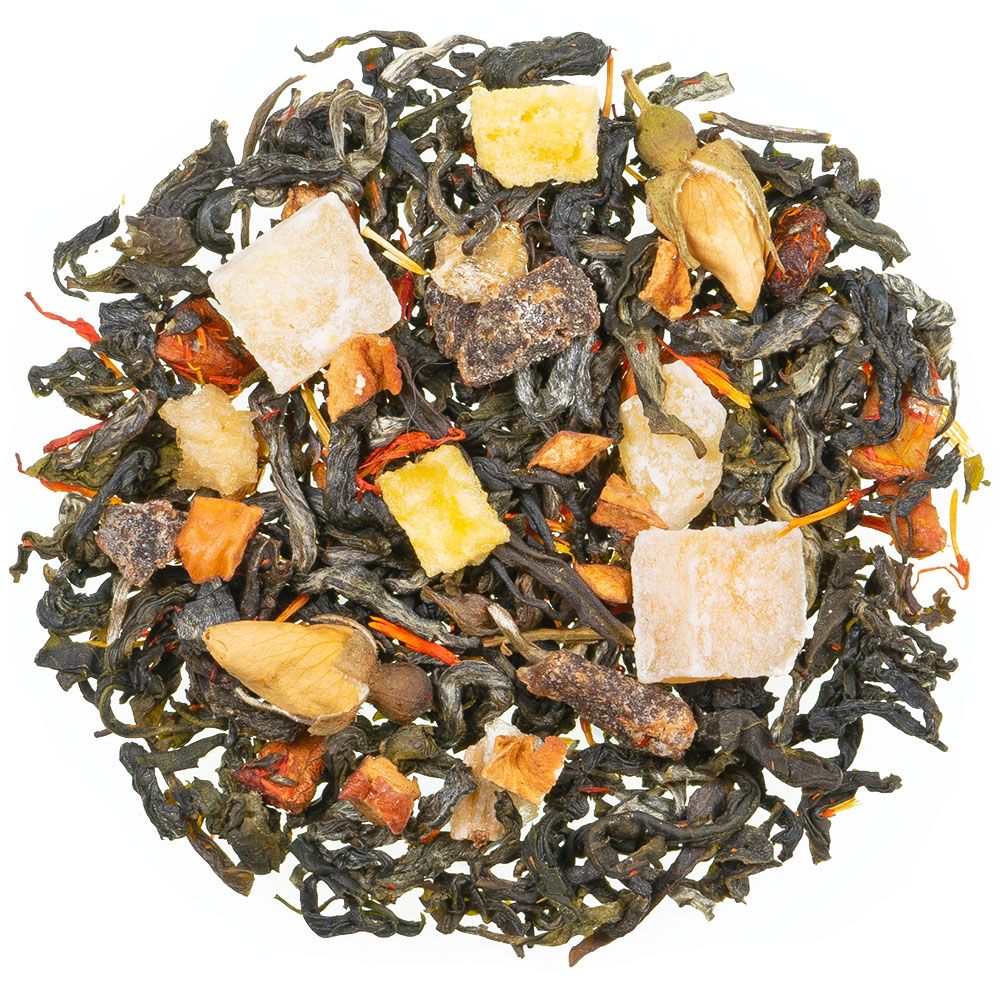 Grüntee mit Blüten und Fruchtstücken, aromatisiert