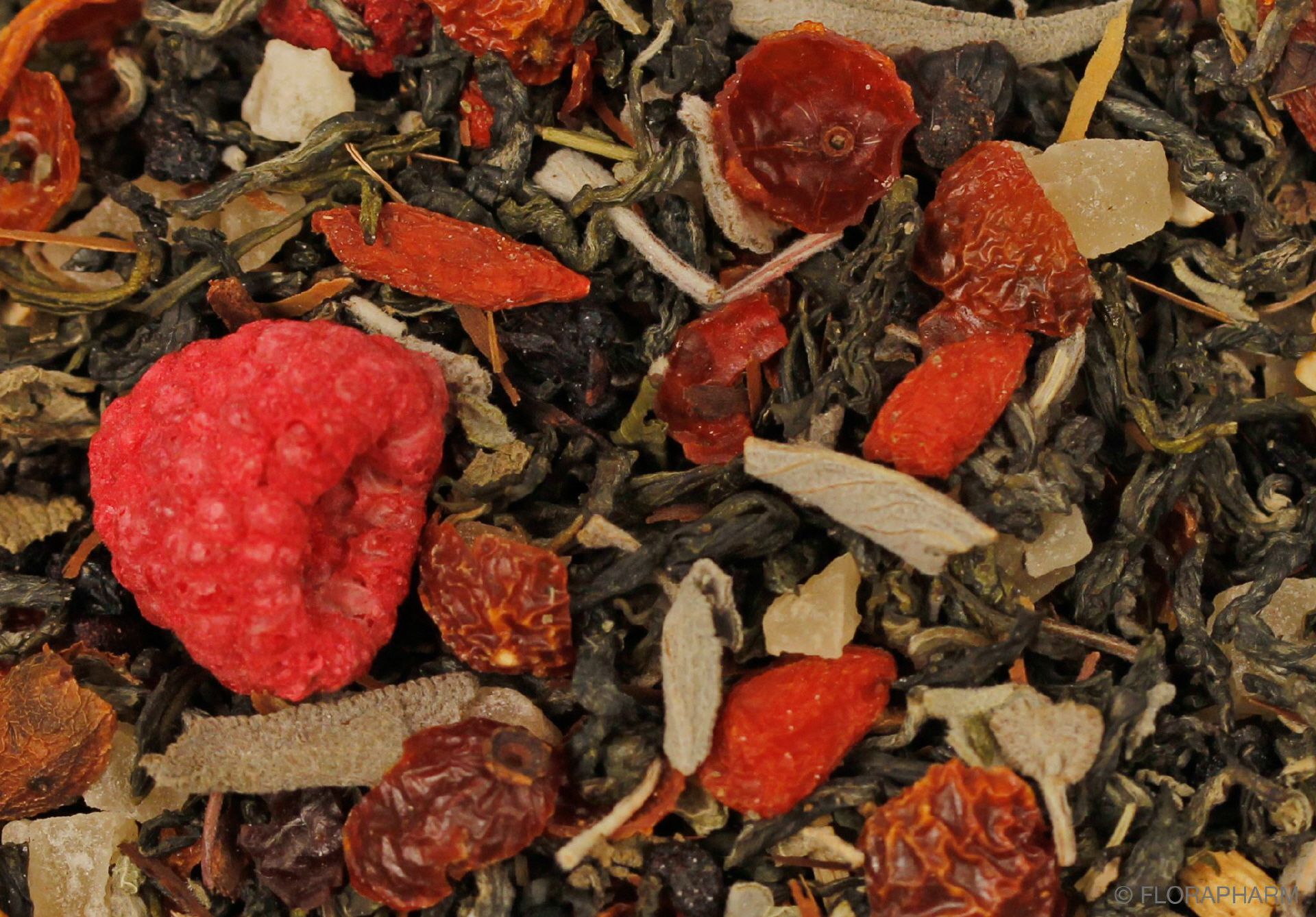 Zutaten: Grüner Tee, kandierte Ananasstücke (Ananas, Zucker), Hagebuttenschalen, natürliches Aroma, Salbeiblätter, Lapachorinde, Holunderbeeren, Gojibeeren (3%), Himbeeren, Ginsengwurzel (0,5%).