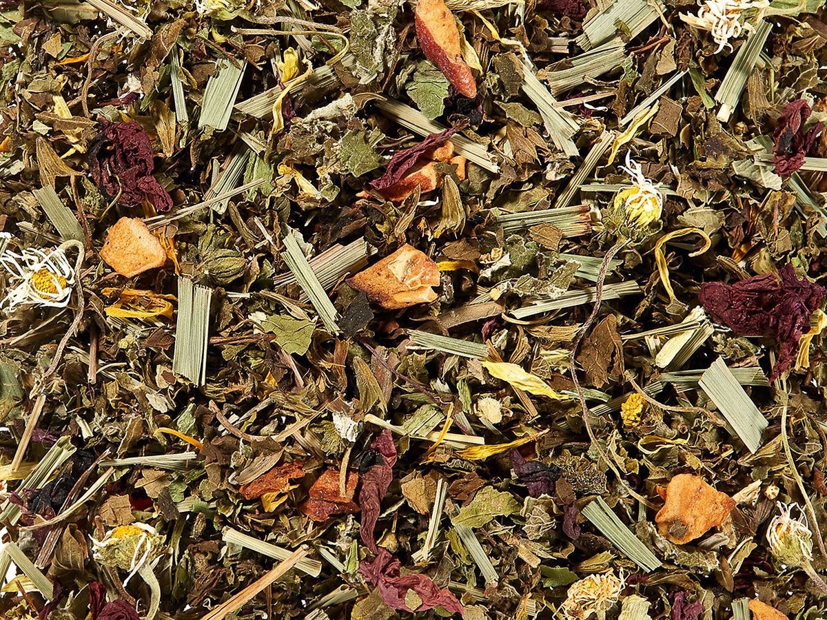 Zutaten: Melissenblätter, Apfelstücke, Lemongras, Brombeerblätter, Himbeerblätter, Spitzwegerich, süße Brombeerblätter, Mädesüßblüten, Gänseblümchen ganz, Spearmint, Mohnblüten, Taubnesselkraut, Ringelblumen.