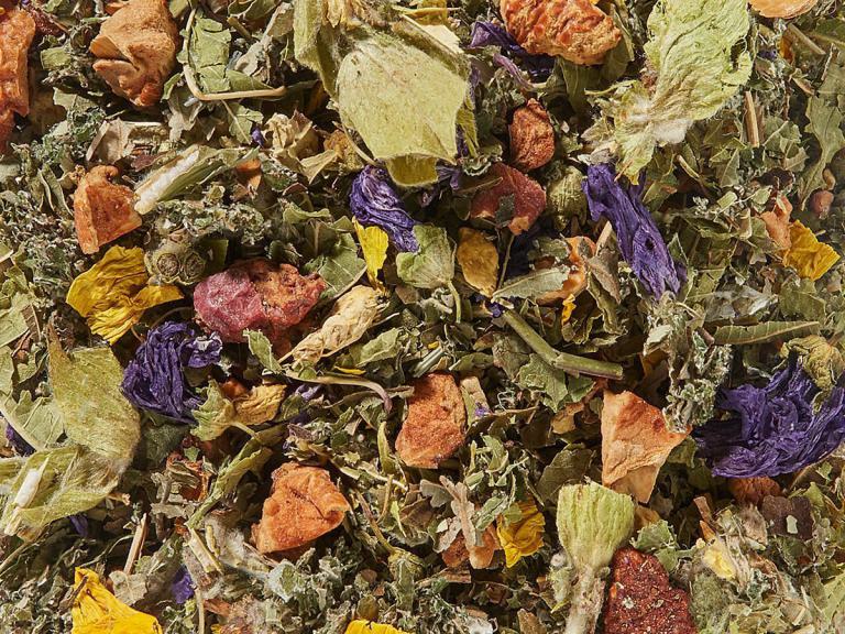 Zutaten: gesäuerte Apfelstücke (Apfel, Säuerungsmittel: Citronensäure), Zitronenverbenenblätter, Apfelstücke, Ingwerstücke, Brombeerblätter, Himbeerblätter, griechischer Bergtee (5%), Brombeerblätter süß, Aroma, Malvenblüten, Sonnenblumenblüten.