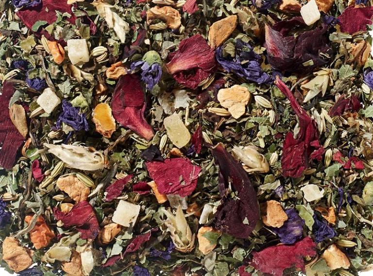 Zutaten: Fenchel, Ananaswürfel (Ananas, Zucker), Apfelstücke, Brombeerblätter, Melissenblätter, weißer Tee (10%), natürliche Aromen, Malvenblüten, Bauernrosenblüten.