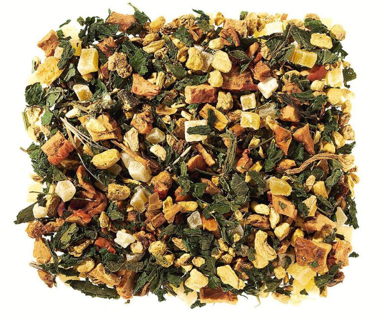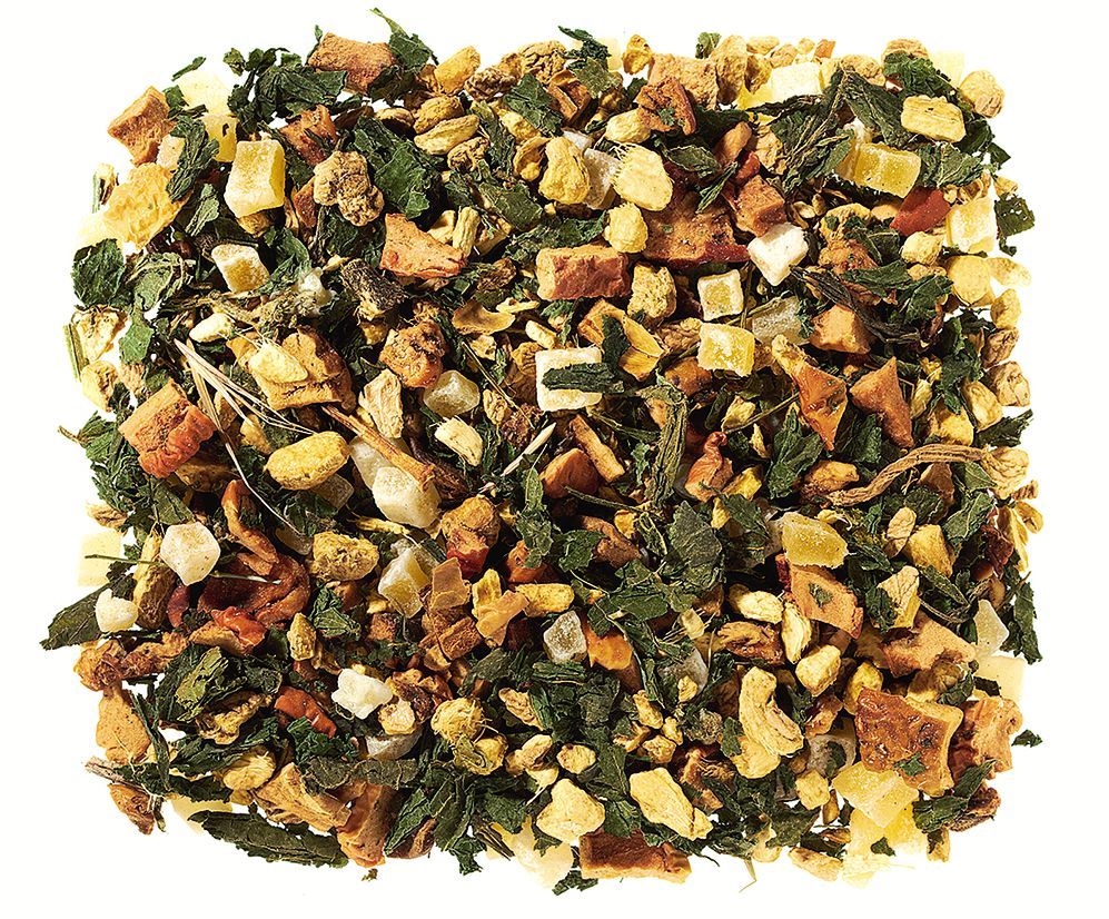 Zutaten: Ingwerstücke, Apfelstücke, Mangowürfel (Mango, Zucker), Brennnesselblätter, Aroma.