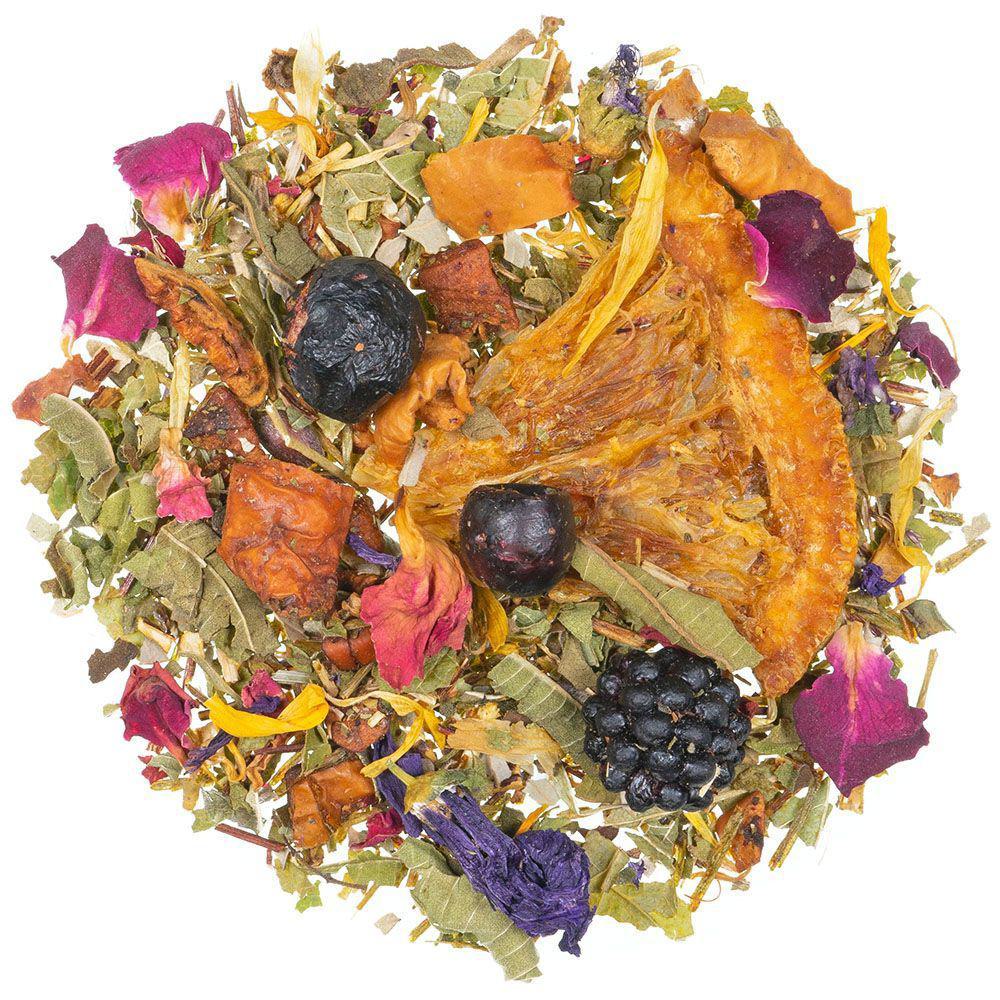 Zutaten: Apfelstücke (Apfel, Säuerungsmittel: Zitronensäure), grüner Rooibos, Verbenenkraut, Aroma, grüner Honeybush, Orangenstücke, Brombeerblätter, Johannisbeerblätter, Malvenblüten, Rosenblütenblätter, Brombeeren(2%), schwarze Johannis- beeren(2%), Ringelblumenblüten
