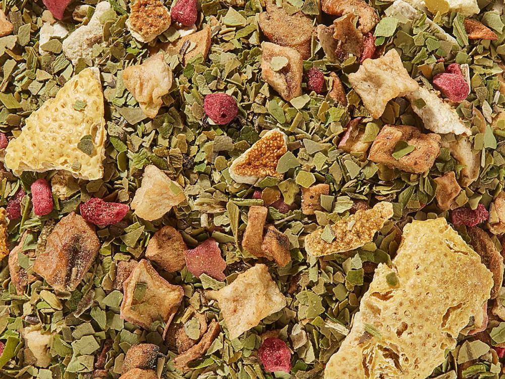 Zutaten: Brasilien Mate, Apfelstücke, Apfelwürfel, Orangenschalen, natürliches Aroma, gefr.-getr. Zitronenschalen, gefr.-getr. Himbeerstücke.