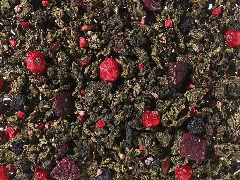 Spritzig-saftige Himbeere trifft auf zarte Blüte, deren Nuancen durch unseren blumigen Oolong noch einmal untermalt werden. Rosenblüten und pinke Kornblumenblüten vollenden die Kreation. Think pink...