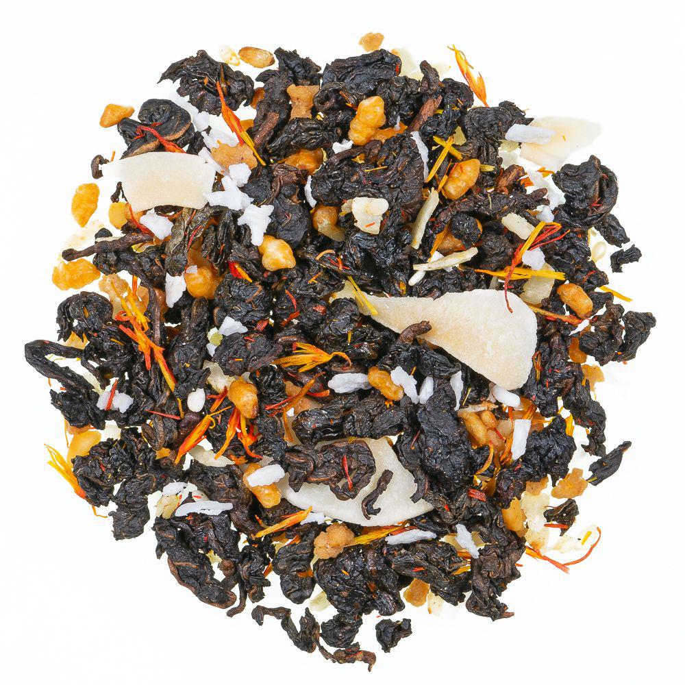 Zutaten: Halbfermentierter Tee, Krokantstücke (Zucker, Haselnüsse), Aroma, Kokoschips (Kokosnuss, Zucker), Kokosraspeln, gerösteter Reis, Sesam(2%), Saflorblüten