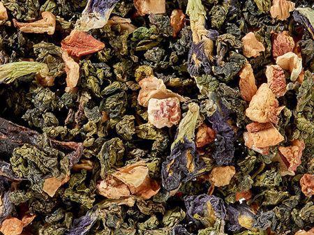 Zutaten: Halbfermentierter Tee (61%) Ti Kuan Yin, Apfelstücke, Pflaumenviertel, Aroma, blaue Klitorienblüten.