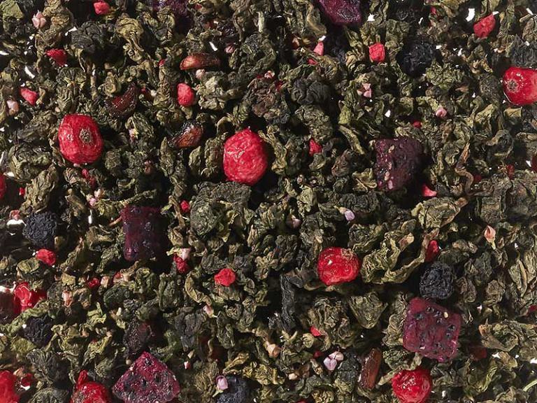 Zutaten: Halbfermentierter Tee (80%) (Ti Kuan Ying Oolong) , lila Drachenfruchtwürfel, Aroniabeeren, natürliches Aroma, Granatapfelkerne, gefr.-getr. rote Johannisbeeren, Heidekrautblüten, gefr.-getr. Himbeerstücke.