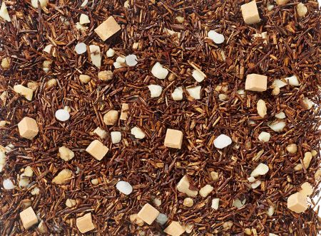 Zutaten: Rotbuschtee, Sahne- Karamellstücke (gezuckerte Kondensmagermilch, Zucker, Glukosesirup, Butterfett, Feucht- haltemittel: Sorbit, Emulgator: Mono- und Diglyceride von Speisefett- säuren), Mandelstücke, Krokant- stücke (Zucker, Haselnusskerne, Invertzucker), Perlensalz, Aroma