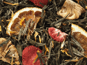 Zutaten: China Sencha und Pai Mu Tan (81 %), Mangoflocken, Ananas- flocken, Orangenspalten, Aroma, Ringelblumen, gefr.-getr. Erdbeerscheiben.